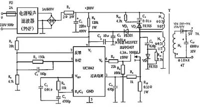 ---由UC3842构成的开关电源电路如图6所示,T为高频变压器。刚开机时,220V交流电先通过PNF滤掉射频干扰,再经过整流滤波获得约+300V直流电压,然后经R2降压后向UC3842提供+16V启动电压。R1是限流电阻,C1为滤波电容。正常工作后,自馈线圈N2上的高频电压经过VD1、C1整流滤波,就作为UC3842的正常工作电压。R5、C4用以改善内部误差放大器的频率响应,R1是斜坡补偿电阻。开关频率 。C5为消噪电容,R10是过流检测电阻,R7是VMOS开关功率管的栅极限流电阻。由C8、VD1、R11、VD2、C9构成两级吸收回路,用于吸收尖峰电压。VD1和VD3选用恢复二极管FR305。VD4为输出级的整流管,采用肖特基二极管,以满足高频、大电流整流之需要。 ---当NMOS管导通时,初级线圈N1电流线性增大,磁场增强,次级线圈中VD4截止,由电容C10向负载供电;此时,脉冲变压器原边回路中VD2亦截止,N1这时起存储能量的作用。当NMOS管截止后,初级线圈电流减小,磁场减弱,次级线圈回路中VD4导通,能量通过VD4及C10向负载释放,输出直流电压,部分能量由VD2向电阻R12和电容C9释放。 ---为保证开关电源输出直流电压不受干扰,电路中提供了稳压电路。一是采用NMOS管源极串接电阻R9,把电流信号变为电压信号,送入UC3842作为比较电压,控制激励脉冲的占空比,达到稳压目的。二是变压器T中的线圈N2间接采样,起到电压反馈作用,N2间接采样后,经过VD1和C3整流,在C3上取样,该电压一方面经过R3和R4分压送到UC3842的2管脚加到误差放大器A3的反相输入端,另一方面直接送到UC3842的7管脚,作为芯片供电电压。电路刚启动时由输入电压经整流滤波降压给芯片供电,工作后由反馈电压供电,因而UC3842的电源电压反映了输出电压的变化,起到反馈作用,使输出电压稳定。三是在UC3842中,锯齿波发生器输出锯齿波的斜率还与输入电压有关,当输入电压升高时锯齿波斜率增大,使输出激励脉冲占空比减小,从而使输出电压维持稳定,反之亦然,实际上相当于反馈控制。